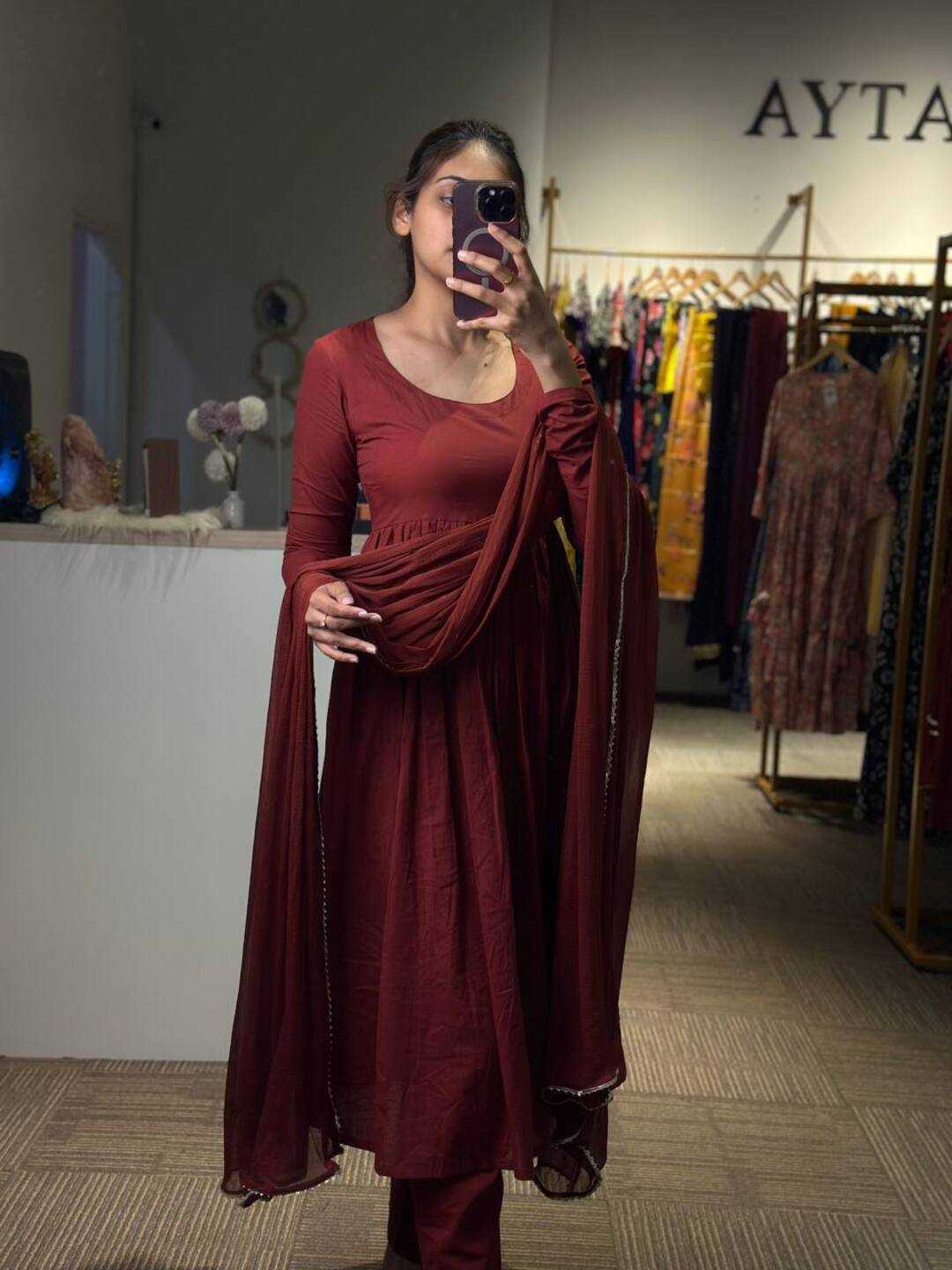 Mustard Brown Anarkali Cotton Suit with Pants and Dupatta