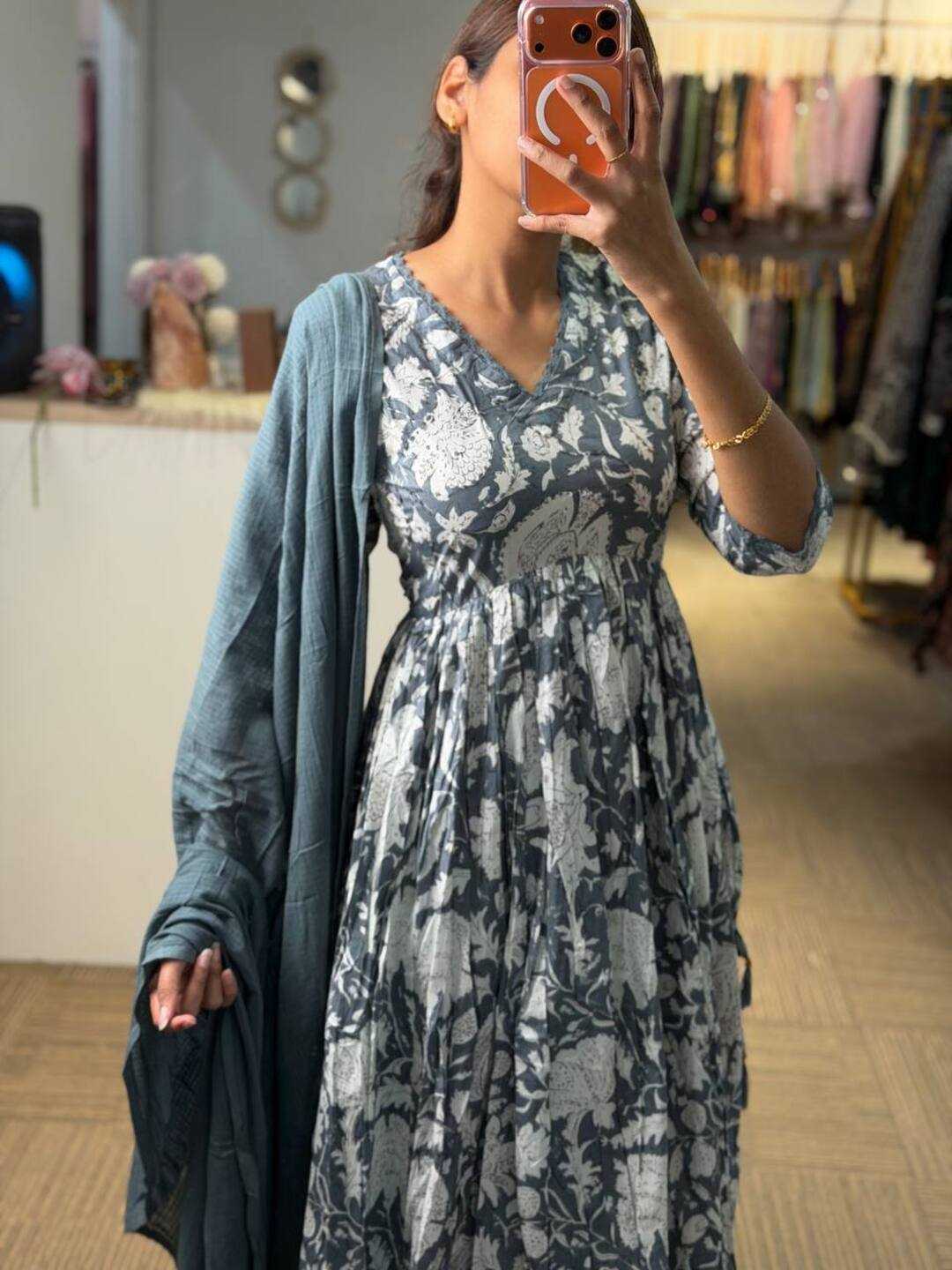 Grey Anarkali Cotton Suit